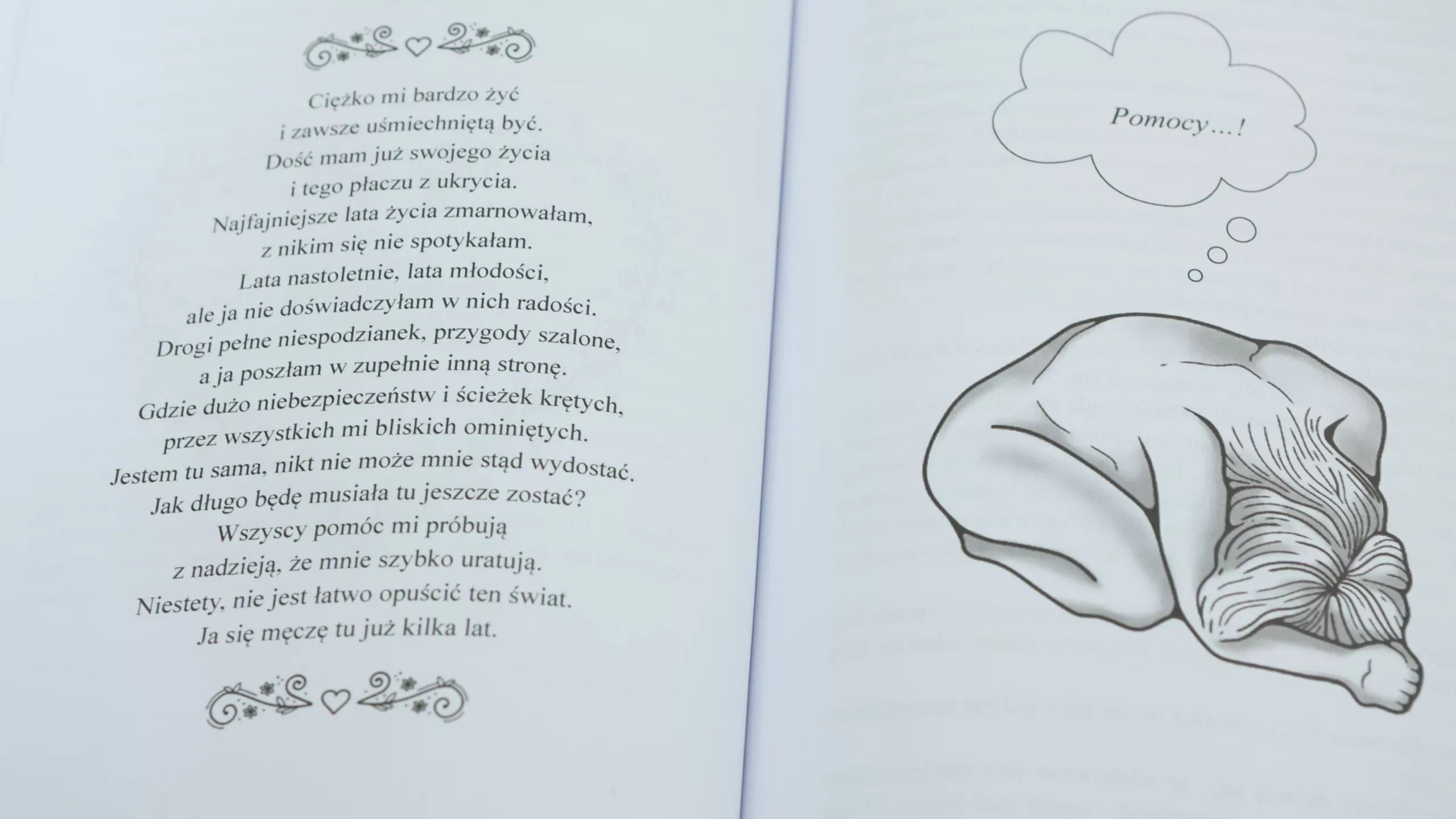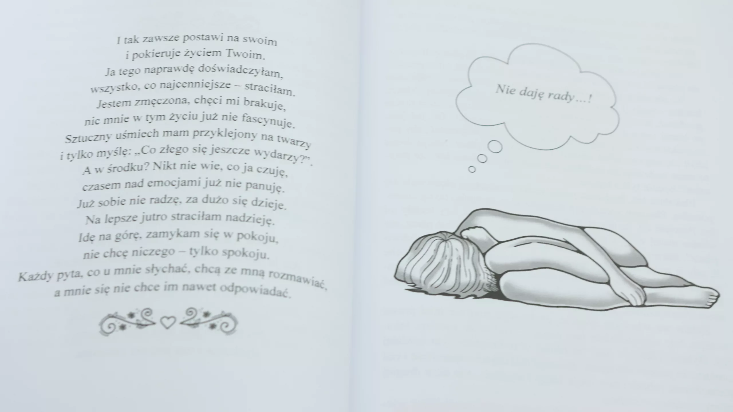 Gdy zdecydowałam się na wydanie książki, to wiedziałam, że będzie inna. Miałam już w głowie, jak będzie wyglądać i chciałam, aby było w niej coś innego, co sprawi, że będzie bardziej interesująca. Sytuacje opisałam w zupełnie inny sposób, bo nigdzie w Internecie nie znalazłam wierszy o tej chorobie. Siadałam i pisałam wszędzie. Uważam, że pasują do tej książki. Jedna osoba powiedziała mi, że wiersze, mimo tego, że są rymowane, odzwierciedlają wszystkie trudne emocje, również w książce znalazł się list mojej siostry bliźniaczki z jej perspektywy, tego jak ona to wszystko odbierała. Książka jest inna, znajdują się w niej grafiki, sentencje, ponieważ chciałam, aby w szczególności osoby walczące z zaburzeniami odżywiania przeczytały to. Wiersze bardzo fajnie ją urozmaiciły. Słowa płynęły ze mnie same, bo tą książkę napisało życie.