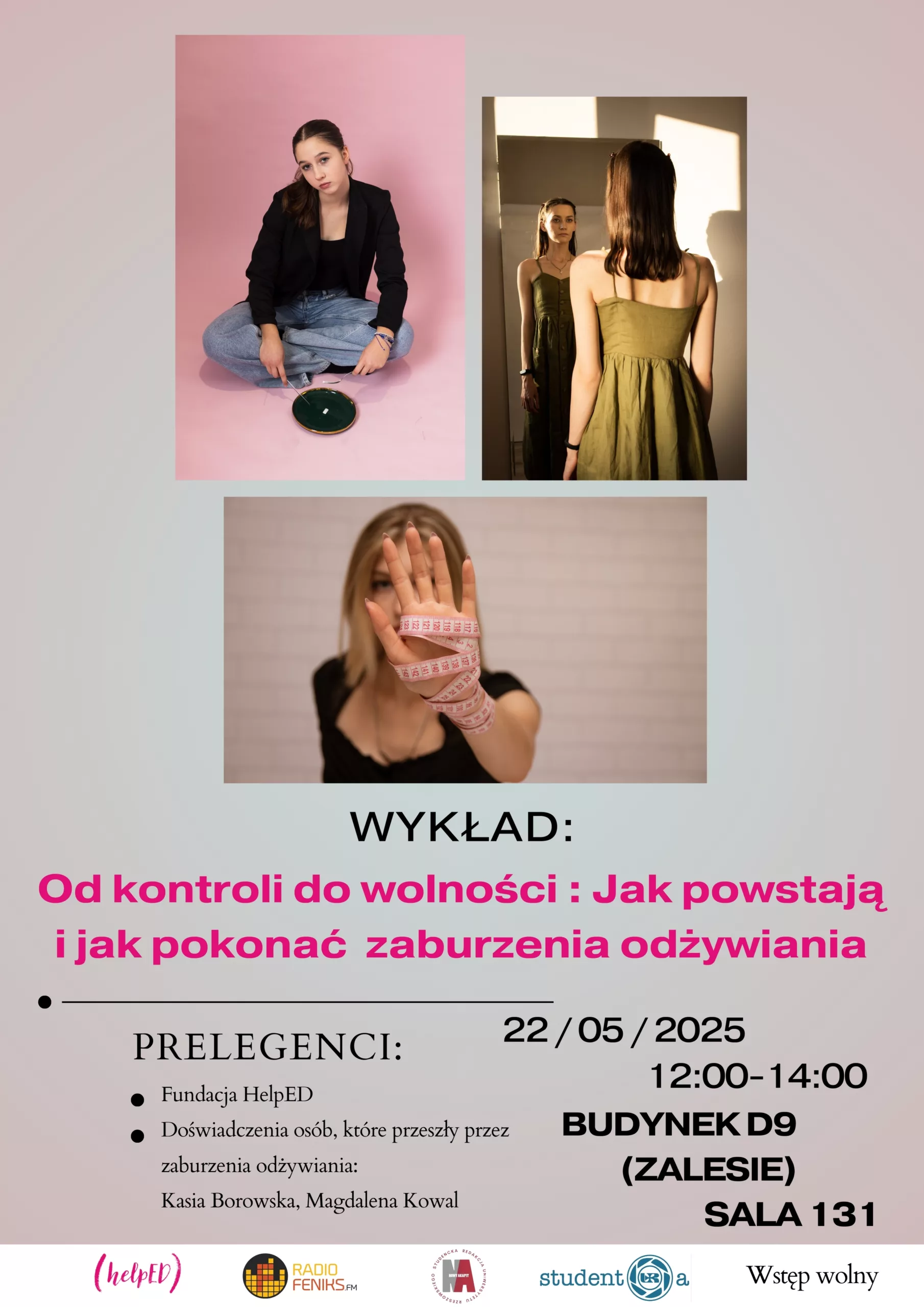 Serdecznie zapraszamy na wykład nt. zaburzeń odżywiania – Od kontroli do wolności: Jak powstają i jak pokonać zaburzenia odżywiania. Odbędzie się 22 maja (czwartek) w budynku D9 ul. Aleksandra Zelwerowicza 4, 35-001 Rzeszów (Zalesie) o godzinie 12:00. W wydarzeniu wezmą udział specjaliści z Fundacji HelpED , którzy wspierają osoby zmagające się z zaburzeniami odżywiania. Oprócz specjalistów będziecie mogli usłyszeć historie osób, które doświadczyły zaburzeń odżywiania. Podzielą się swoją historią walki oraz powrotu do zdrowia – będą to Kasia Borowska, Weronika Stanisławczyk oraz Magdalena Kowal. Wykład ma na celu zwiększenie świadomości na temat zaburzeń odżywiania, ale też będzie można dowiedzieć się, jak pomóc i wspierać osoby, które zmagają się z tym problemem.