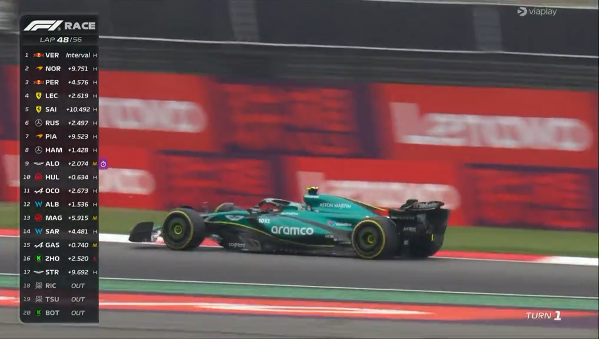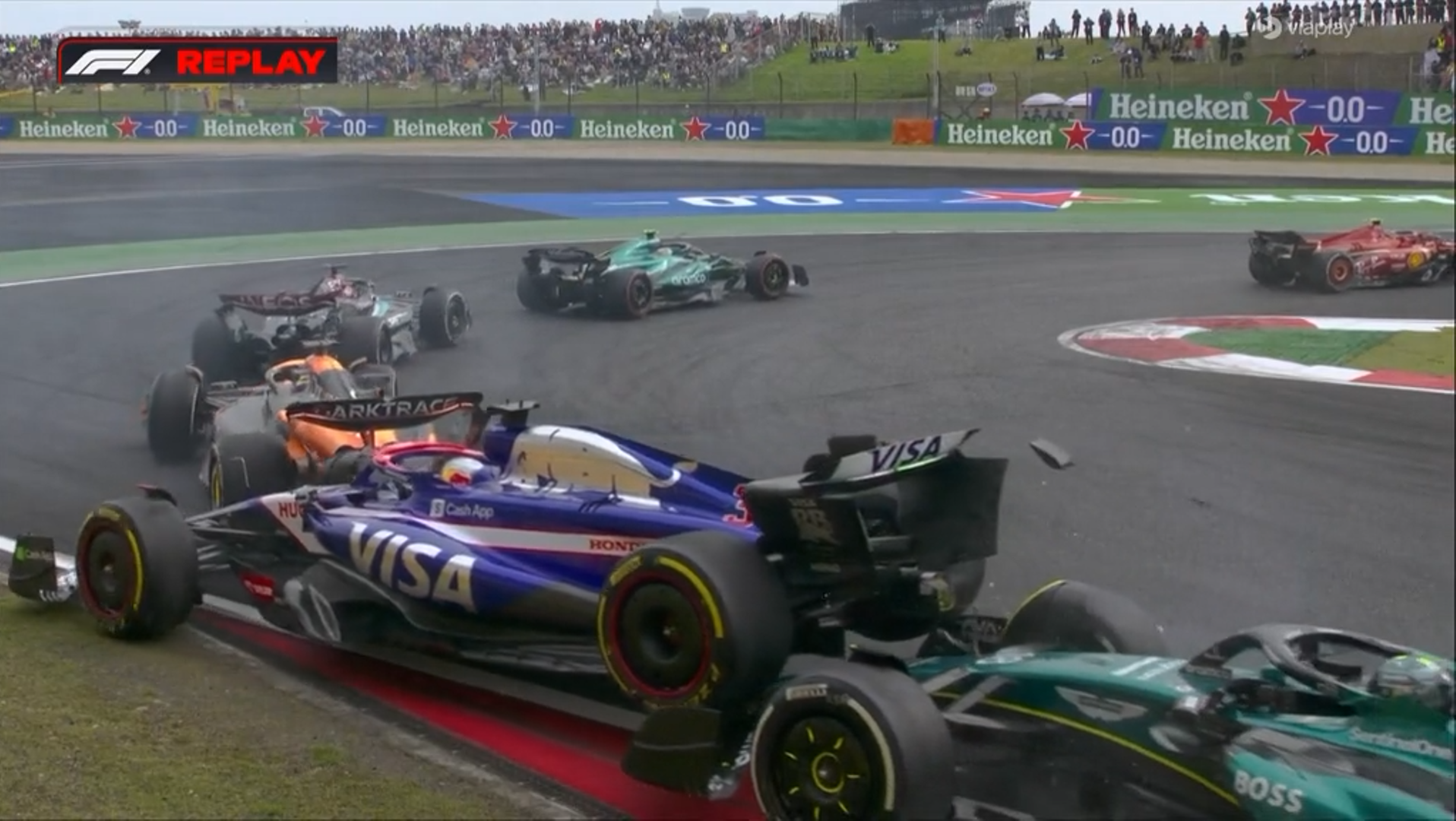 Po zjeździe Safety Cara posypały się kary od sędziów. Dziesięć sekund otrzymali Logan Sargeant za wyprzedzanie podczas neutralizacji oraz Magnussen i Stroll za spowodowanie kolizji. Z uszkodzeniami długo na torze nie wytrzymał Daniel Riccardo, który na 33 okrążeniu wycofał się z wyścigu. W środku stawki, po fatalnych kwalifikacjach przebijał się Lewis Hamilton, który wskoczył do czołowej 10.