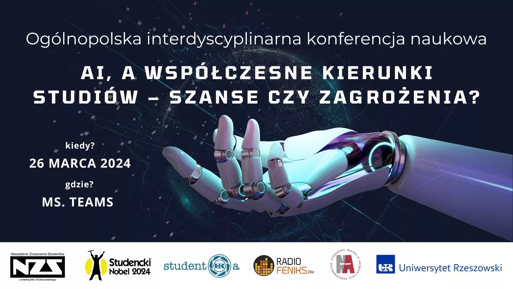 Ogólnopolska interdyscyplinarna konferencja naukowa AI, a współczesne kierunki studiów – szanse czy zagrożenia? jest częścią ogólnopolskiego projektu Studencki Nobel, będącego cyklicznym konkursem stypendialnym organizowanym przez Niezależne Zrzeszenie Studentów.