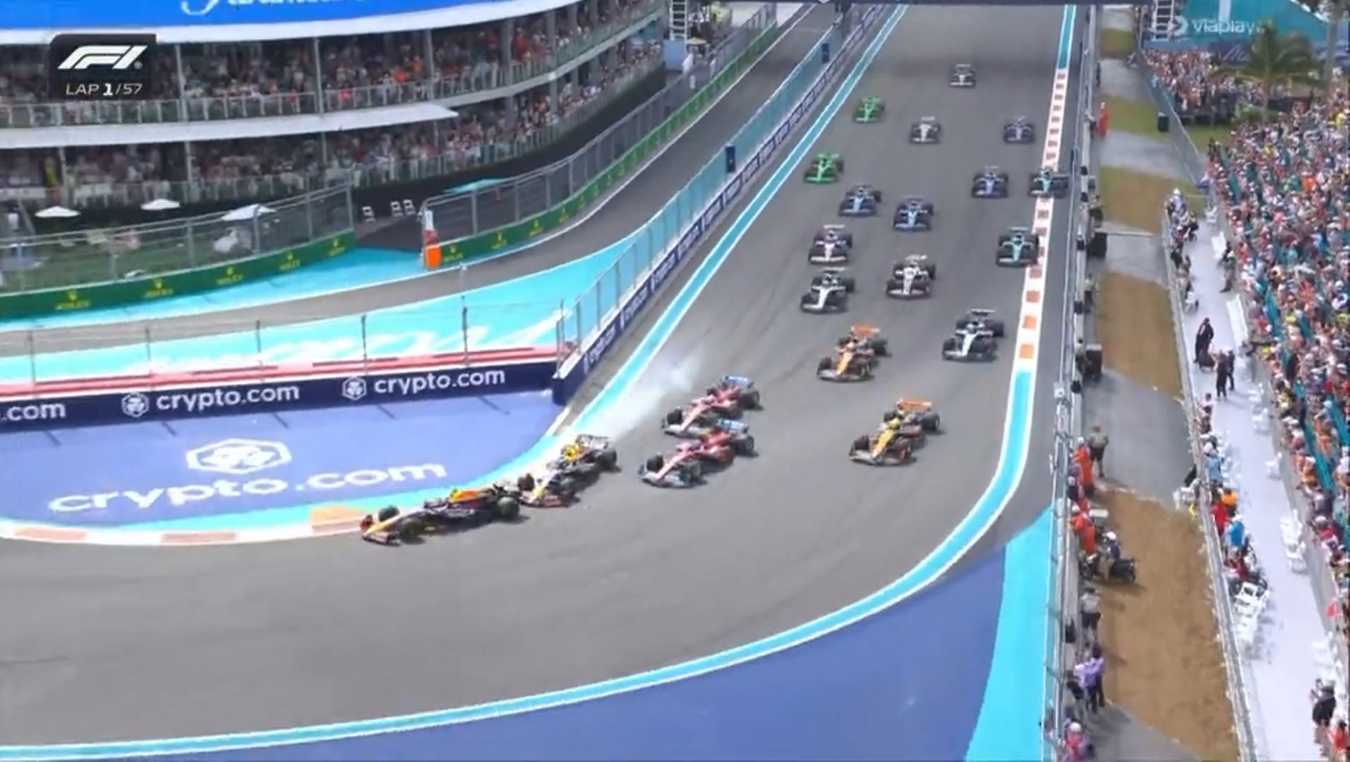 Po starcie, o mały włos nie doszło do kolizji w Red Bullu. Sergio Perez zblokował koła w pierwszym zakręcie i cudem uniknął rozbicia tylnego skrzydła Verstappena. Bardzo dobry start zaliczył Oscar Piastri, który po starcie z 6 pola awansował na 2 miejsce.