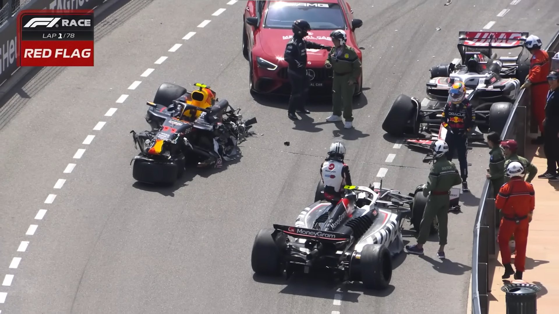 Jednak zanim doszło do groźnie wyglądającej kolizji, Carlos Sainz przestrzelił zakręt i spadł na tył stawki. Za chwilę jednak wszyscy ujrzeli czerwone flagi. Jak się okazało wspomniany Perez rozbił się z Kevinem Magnussenem. Sytuacja wyglądała dosyć groźnie, jednak obaj panowie wyszli cało z incydentu. Niefortunnie zespołowy kolega Kevina również musiał zakończyć udział w wyścigu dzięki tej kolizji. To jednak nie koniec, bo kierowcy Alpine również postanowili dostarczyć wrażeń i doszło pomiędzy nimi do kontaktu. Wyścig, jak się poźniej okazało, w stanie był dokończyć tylko Pierre Gasly.