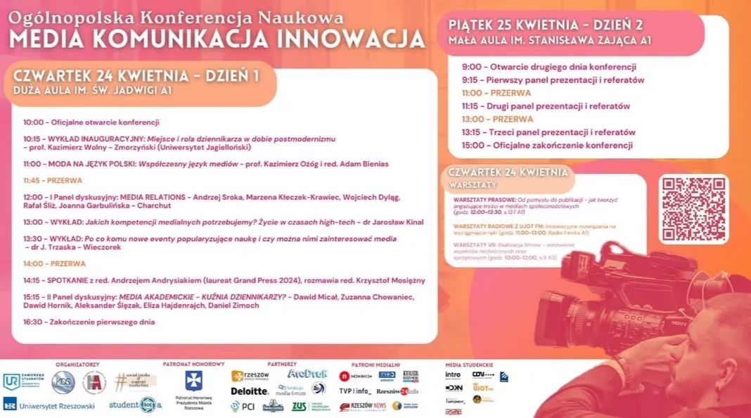 Konferencja odbędzie się w dniach 24–25 kwietnia 2025 r. w Instytucie Polonistyki i Dziennikarstwa Uniwersytetu Rzeszowskiego w trybie stacjonarnym. Organizatorami konferencji są: koło naukowe Klub Dziennikarzy Studenckich we współpracy z Samorządem Studentów Uniwersytetu Rzeszowskiego oraz Studenckim Kołem Naukowym Social Mediów i Content Marketingu.